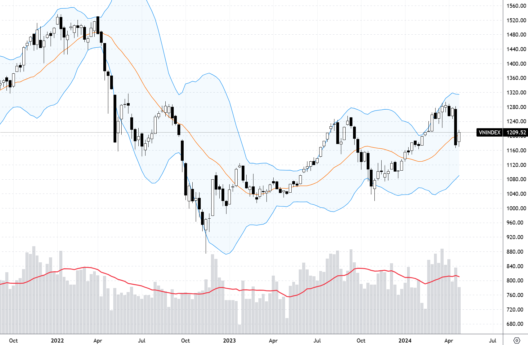 Chỉ số VN-Index đã tăng điểm trở lại sau một tuần đầy “sóng gió” trước đó, từ mức điểm thấp nhất 1.164 điểm lên 1.209 điểm đóng cửa ngày 26/4. Những phiên giảm điểm với khối lượng giao dịch cao nhưng những phiên tăng điểm lại có khối lượng khá dè dặt, tương đối thấp. Điều này có thể đang cho thấy một số lượng lớn nhà đầu tư đang thật sự quan ngại về thị trường chung nên đã hiện thực hóa lợi nhuận của mình và đang đứng ngoài theo dõi những diễn biến tiếp theo.